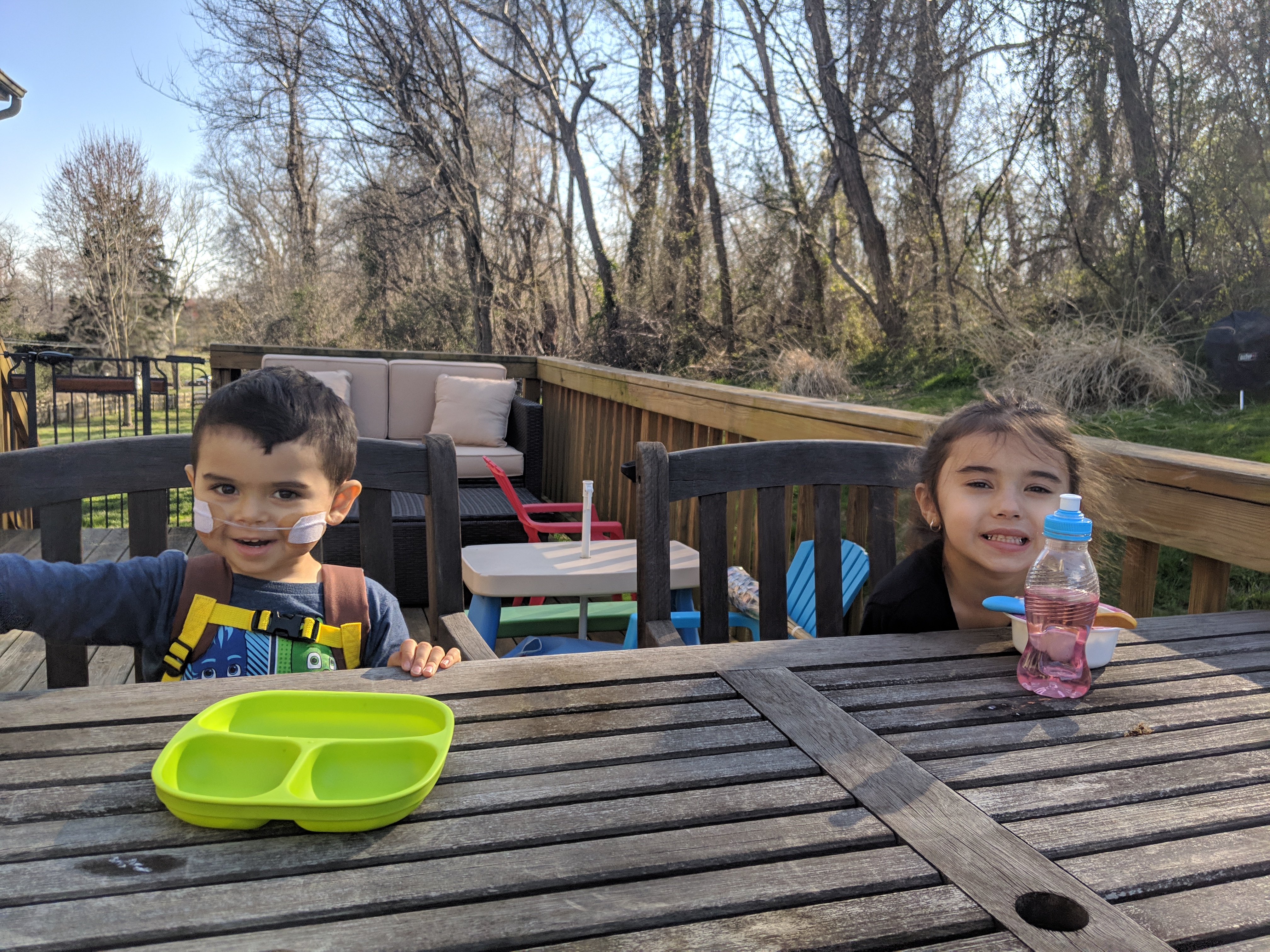 It was so beautiful outside this evening that I took the babes out on the back deck to eat dinner. Noli talked about her day at school and then I turned to Kieran encouraging him to interact with us. Despite his cognitive limitations and speech delay, he has made incredible progress — proof being in how he responded tonight. He locked eyes with me and softly uttered, “Mommy, I want food.”
